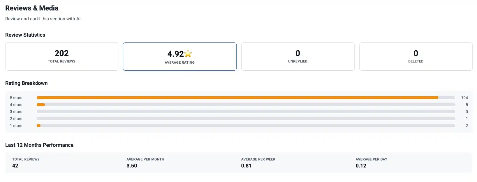 | Velocity | How steadily new reviews arrive over time | A consistent flow of new reviews signals an active, trusted business. Periodic bursts followed by silence look artificial and can trigger spam filters. | ⭐⭐⭐⭐⭐ |