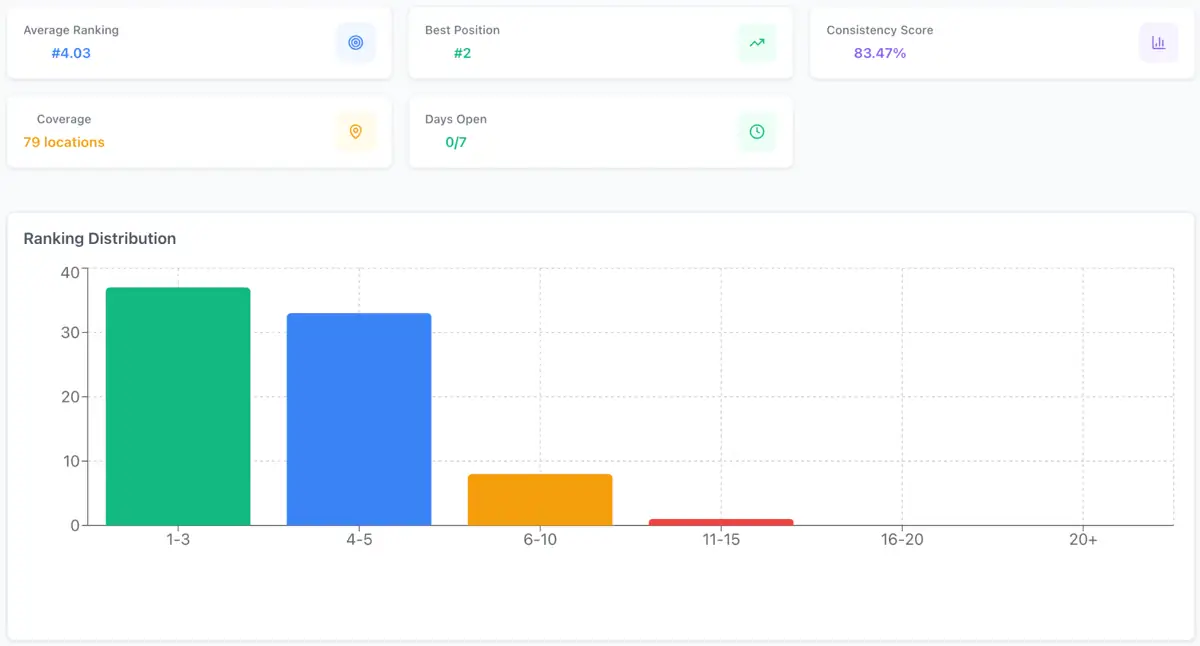 SEO services local rank tracker dashboard showing Google Maps ranking distribution and performance metrics