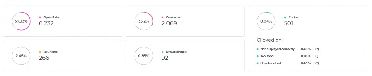 From the total rate chart, you can find general info in percentage, but it also essential to know the exact number of every of this percent. Below the total rate chart and the calendar you can find detailed statistics about the exact number of email that was opened, bounced, converted, unsubscriber and clicked. Also, we've designed a unique chart for the clicked email rate. You can find the exact number of emails for the links in email - "Not displayed correctly", "Too soon" or "Unsubscribe".