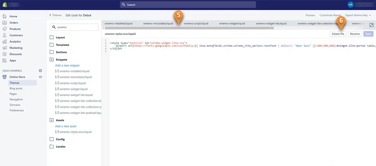 For that, you need to open every file starting with "wiremo" in separated tabs (pin 5) and click on the “Delete file” button for every file separately (pin 6). Once done click on the “Save” button. After that refresh the Shopify dashboard and repeat the search for Wiremo files to make sure that there is nothing more to delete.