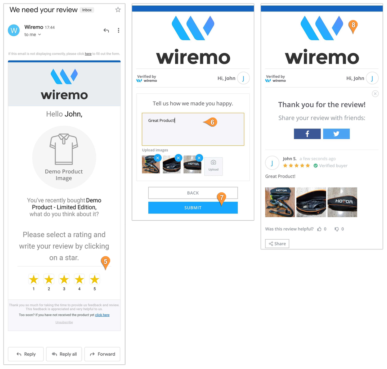- In-Email - by using this type of campaign you can ask your customers to submit their reviews directly in the email window.When a review request email arrives, the customer chooses the rating (Pin 1) and below writes the review text (Pin 2), directly in the email, then clicks on the "Submit review" button (Pin 3). On the next page, the customer can see the review already left (Pin 4).